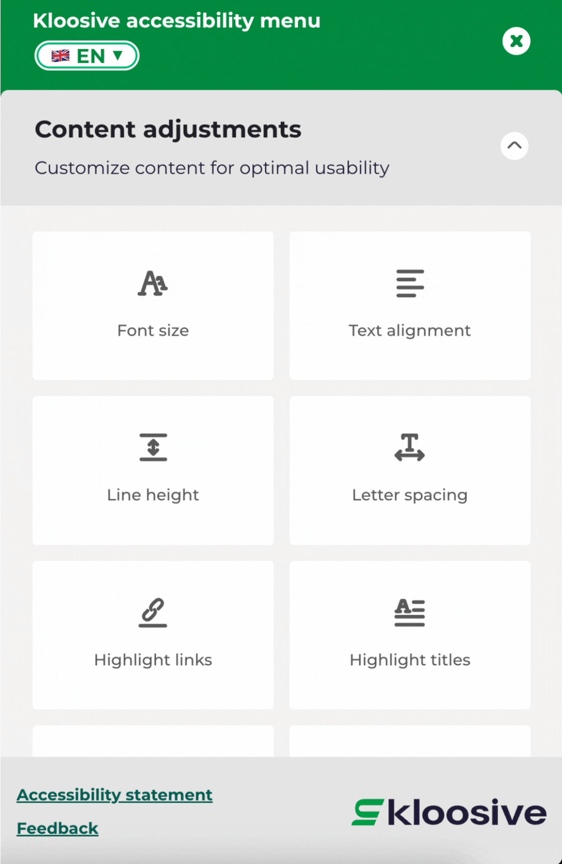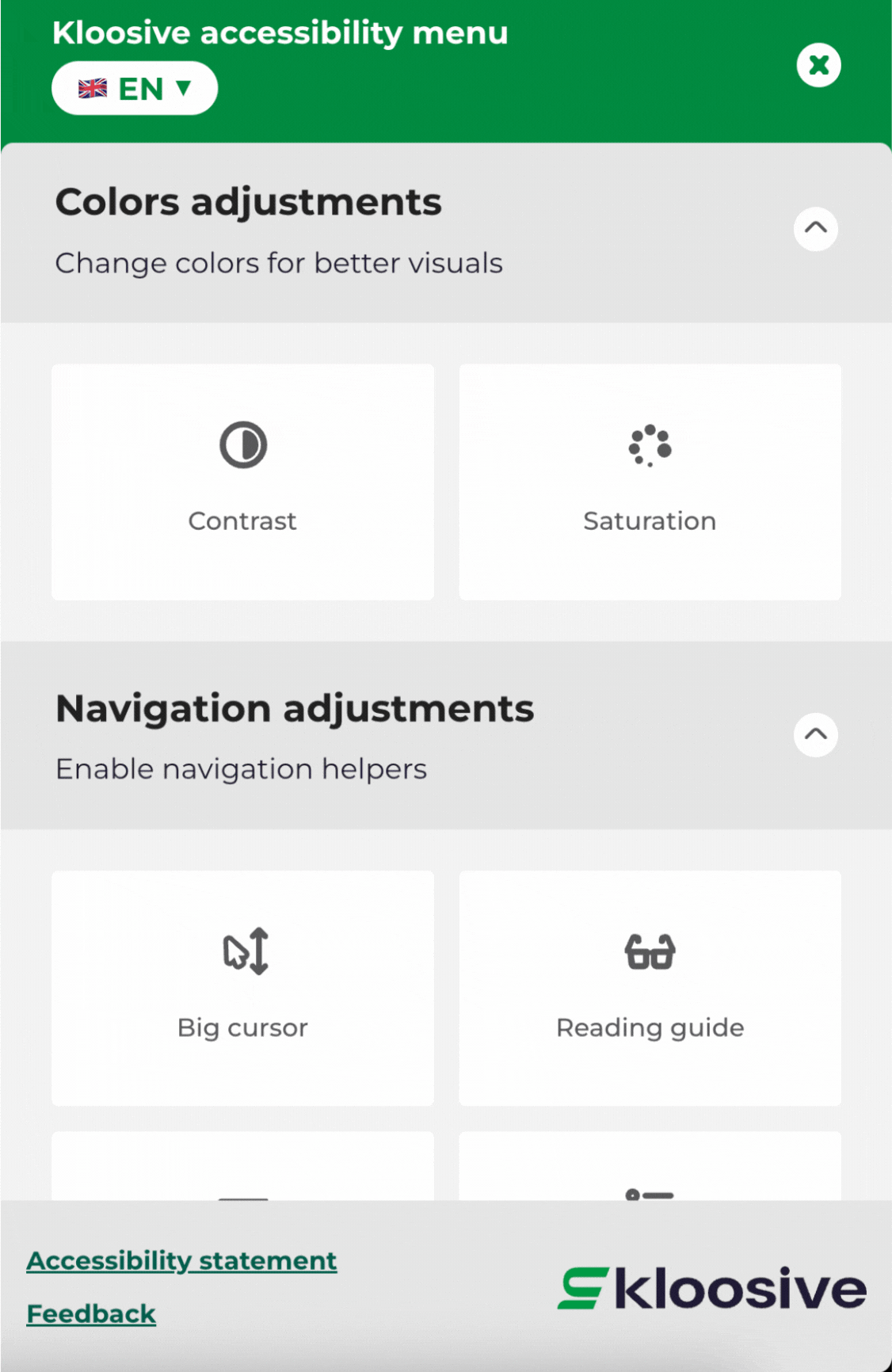 Fitur Penyesuaian Warna memberikan dukungan penting bagi individu dengan gangguan penglihatan seperti buta warna. Fungsi aksesibilitas penting ini memberdayakan pengguna untuk menyesuaikan skema warna situs web dengan preferensi mereka. Widget Kloosive memastikan bahwa individu dengan gangguan penglihatan dapat memodifikasi desain situs web dan antarmuka pengguna, menyelaraskannya dengan persyaratan aksesibilitas khusus mereka, dan mengikuti pedoman WCAG.